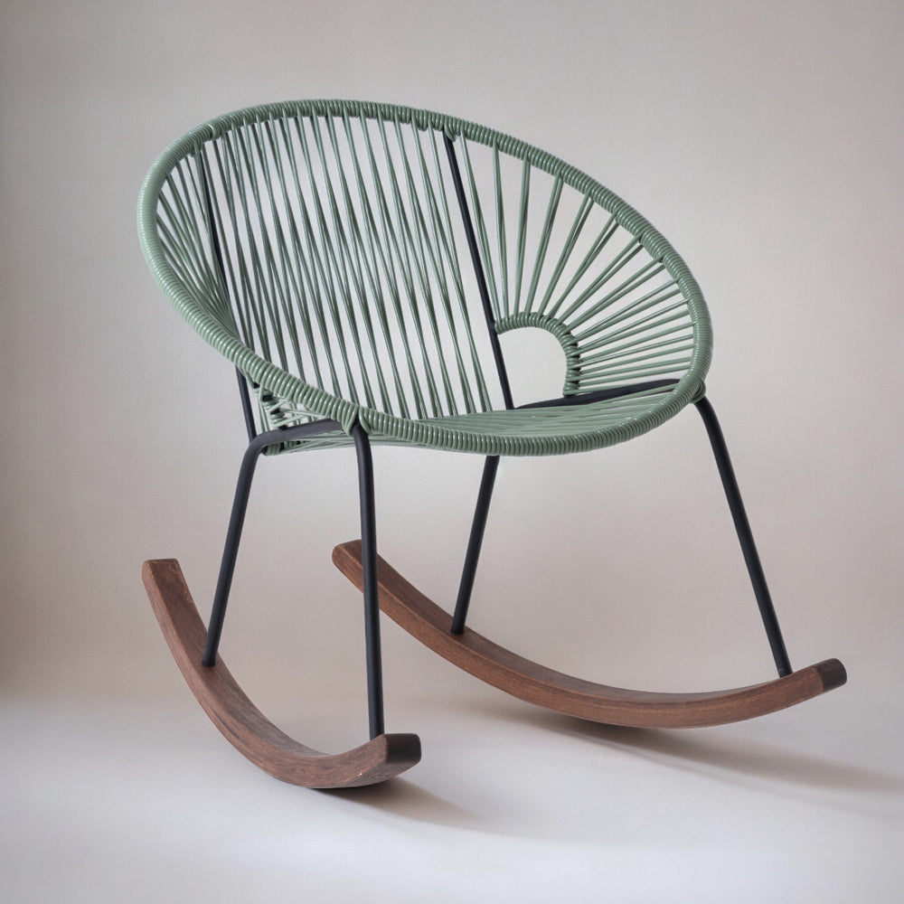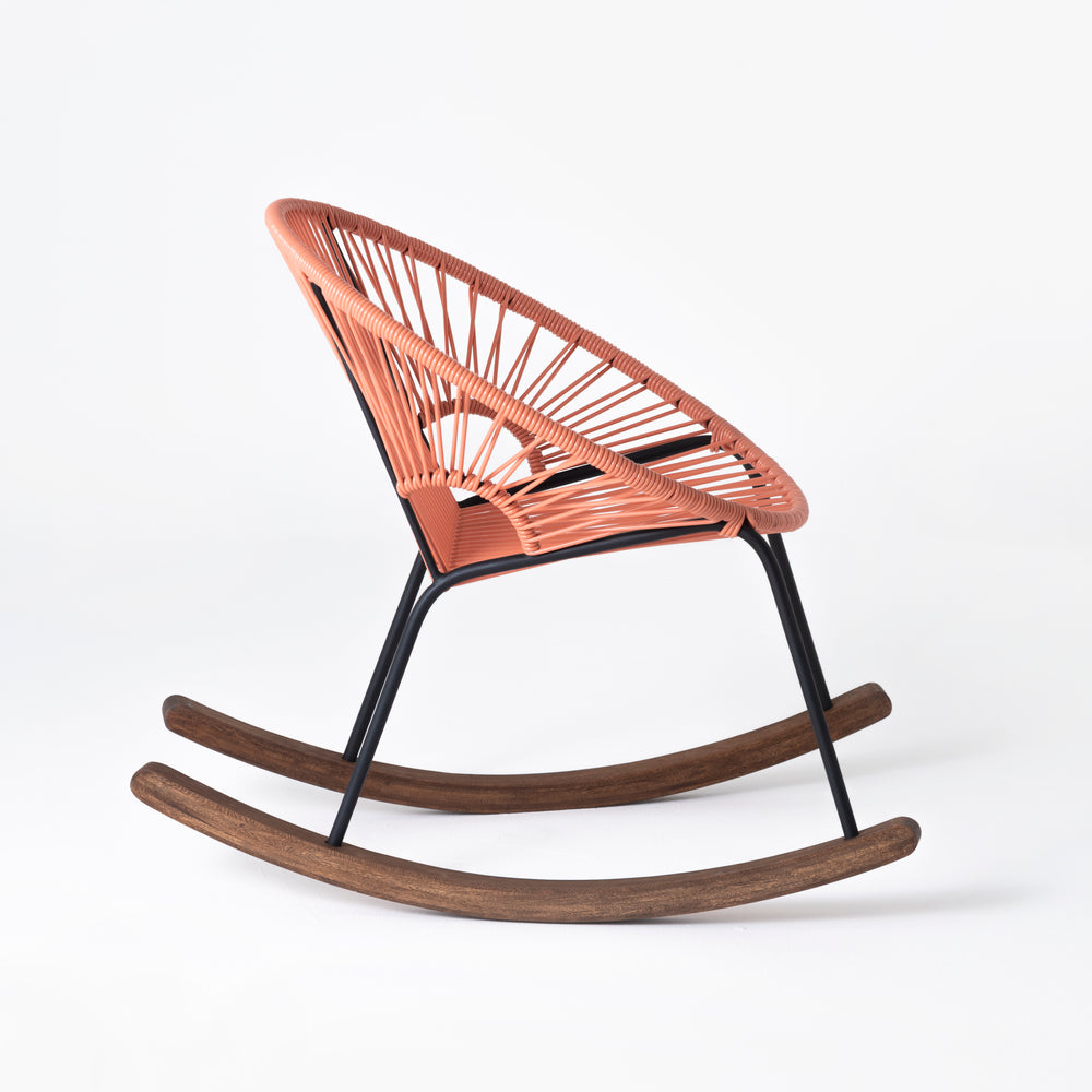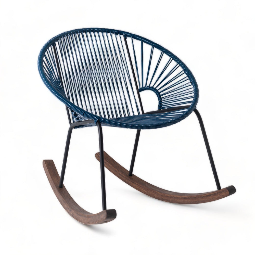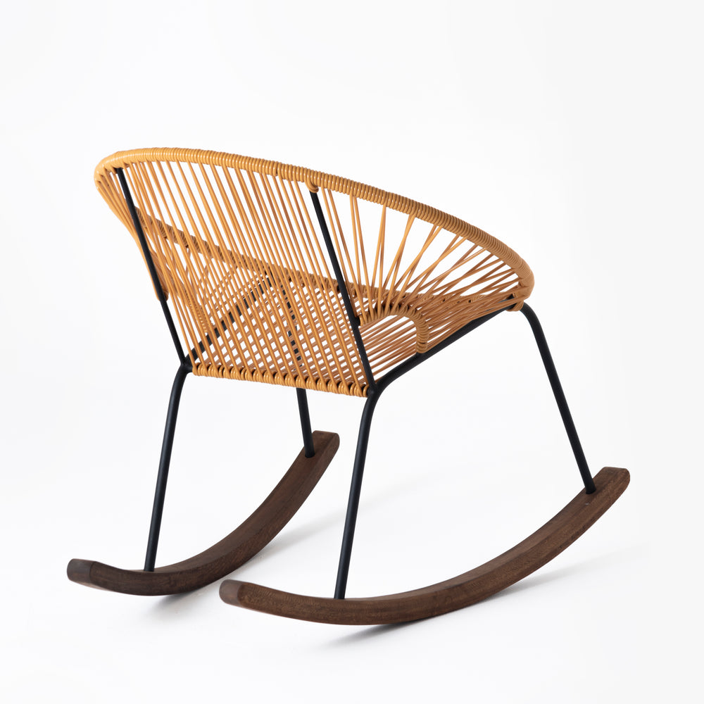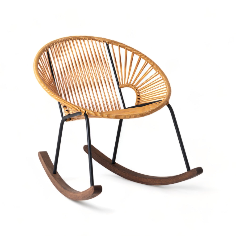 Ixtapa Rocking Lounge Chair by Mexa. Featuring wooden legs, a metal frame, and hand-woven PVC. Suitable for both indoor and outdoor use. Designed by Mexa.