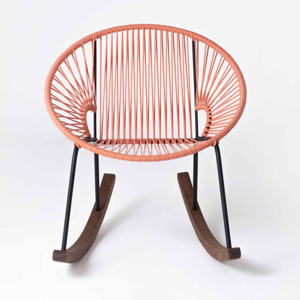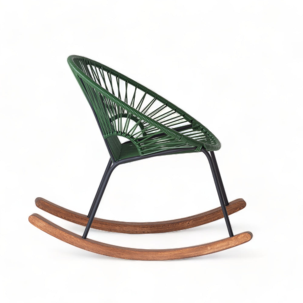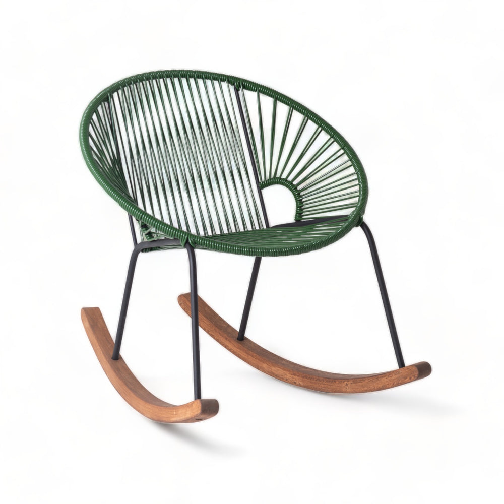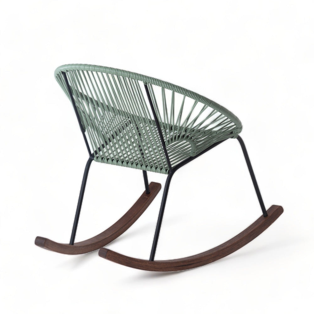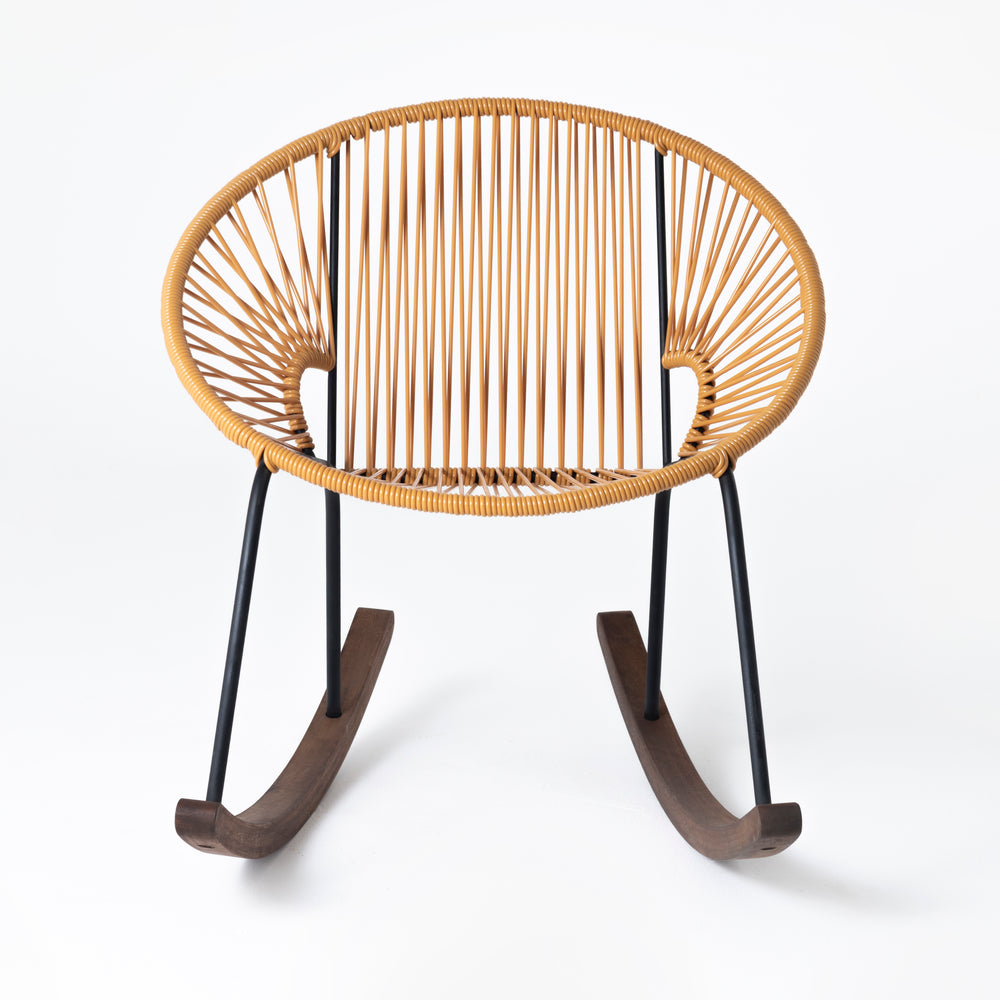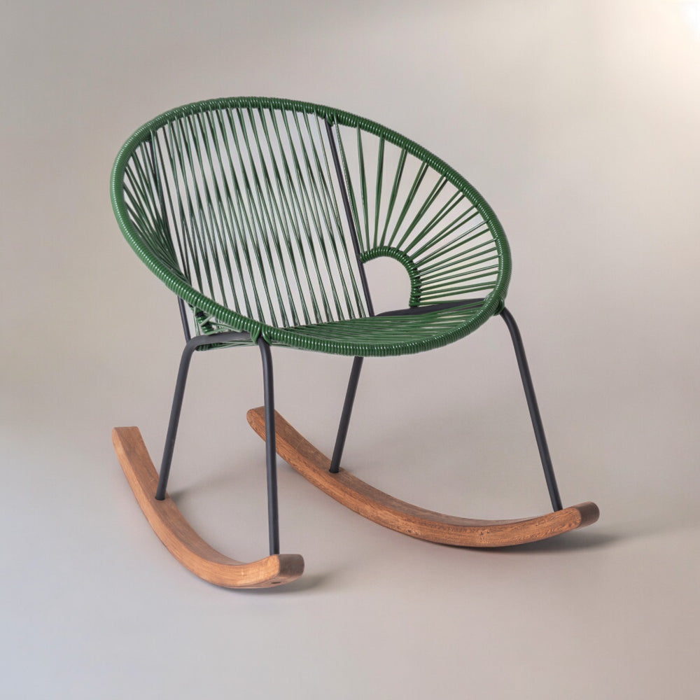 Ixtapa Rocking Lounge Chair by Mexa. Featuring wooden legs, a metal frame, and hand-woven PVC. Suitable for both indoor and outdoor use. Designed by Mexa.