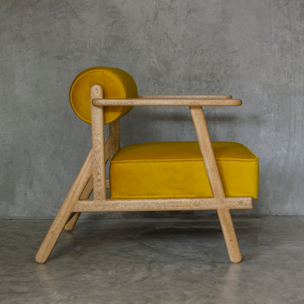Lounge chair with arms, upholstered in velvet fabric and crafted from solid Rosa Morada wood. Designed by Chimiyu. Upholstered seat and back cushions in velvet fabric. COM availability.