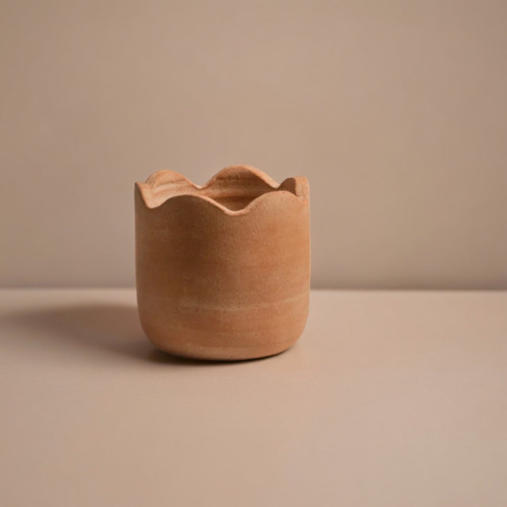 Wavy Small Tabletop Terracotta Planter. Designed by Diego Olivero Studio for Meso. Handcrafted by Artisans in Sabana Grande, Honduras. Needs a container, no drainage hole.