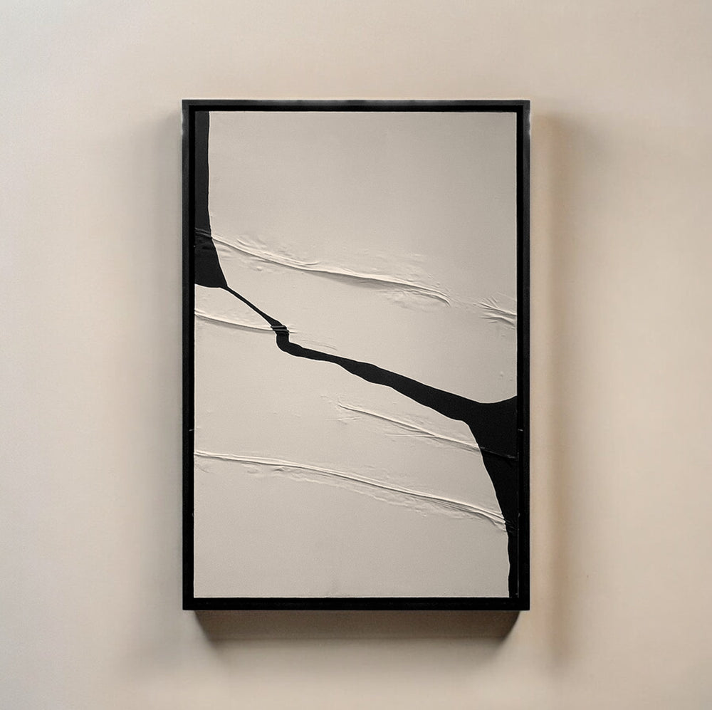 Minimalist abstract artwork with textured white and bold black cracks.