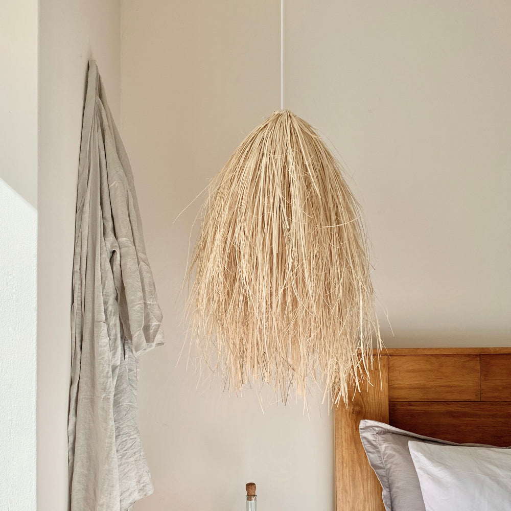 Pendant lamp with fringed palm fiber in natural color. Includes ceiling canopy, 19.7-inch cable, and outlet for E26/27 type luminaire. Bulb included.