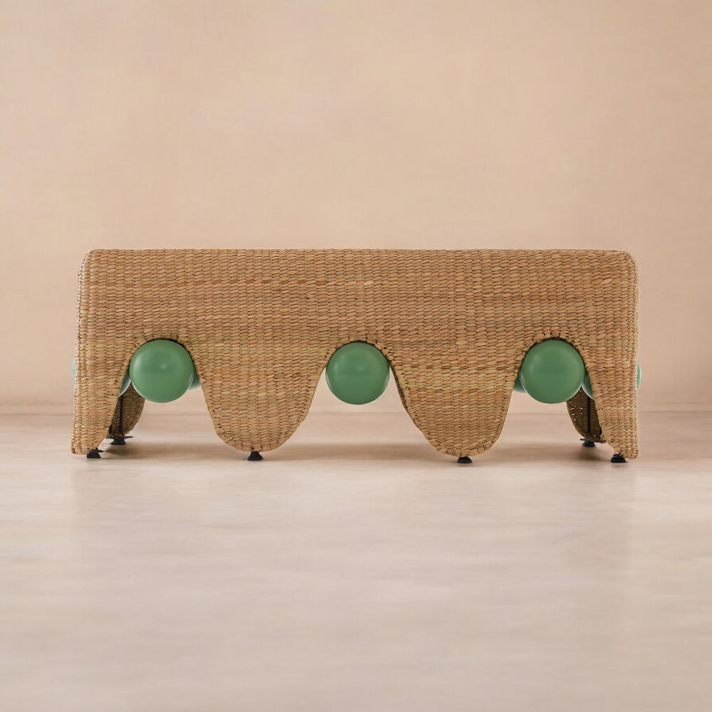 Bench crafted by weaving Chuspata fiber into a metal structure, with details in lacquered wood spheres.