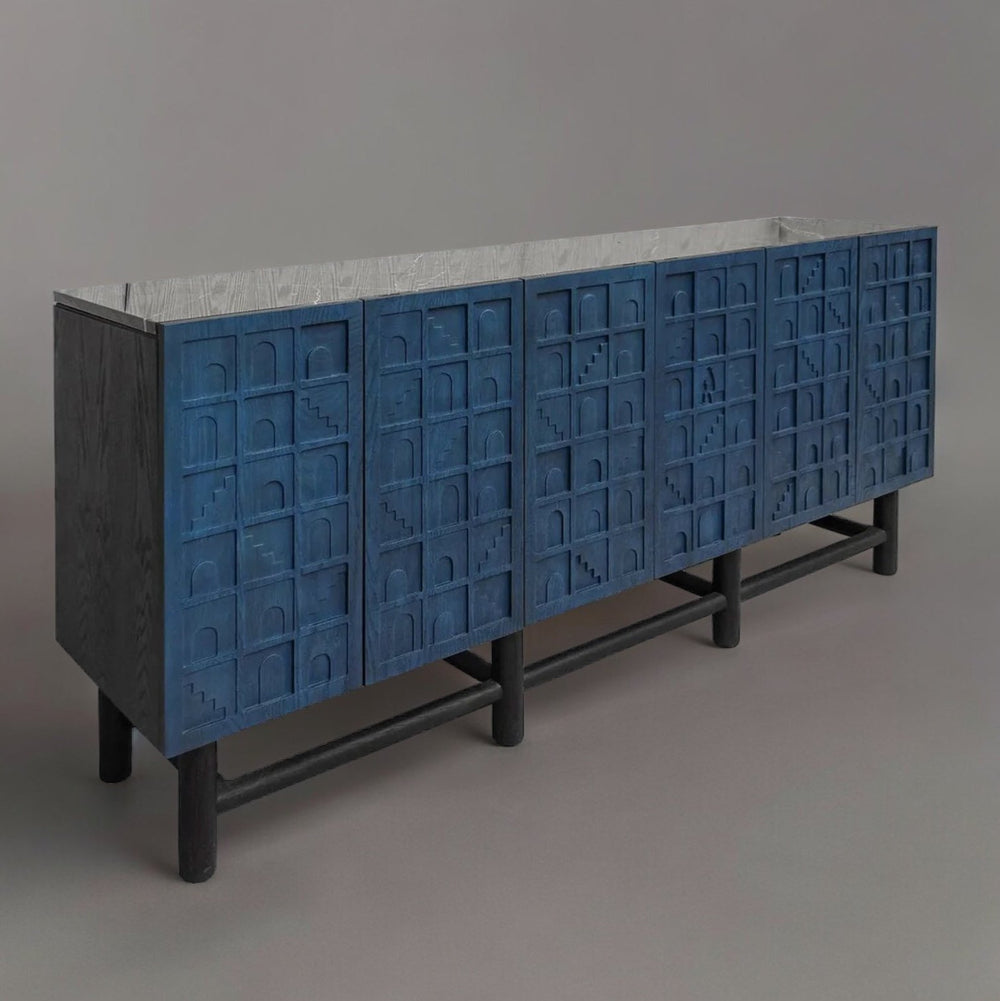 Maria Piedad Horizontal Sideboard using Oak Wood and Marble. Handcrafted in Mexico.