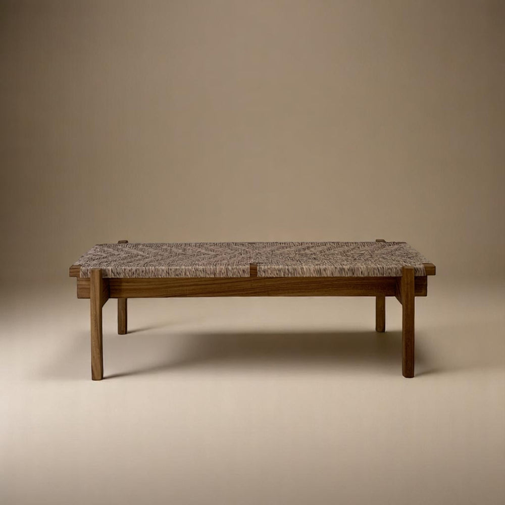 Bench crafted from natural Rosa Morada wood, featuring a hand-woven seat made from natural-colored palm fiber.