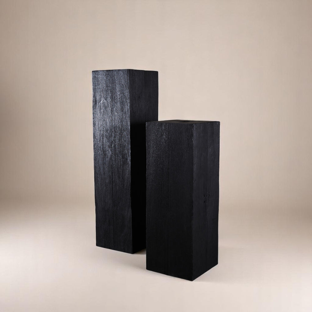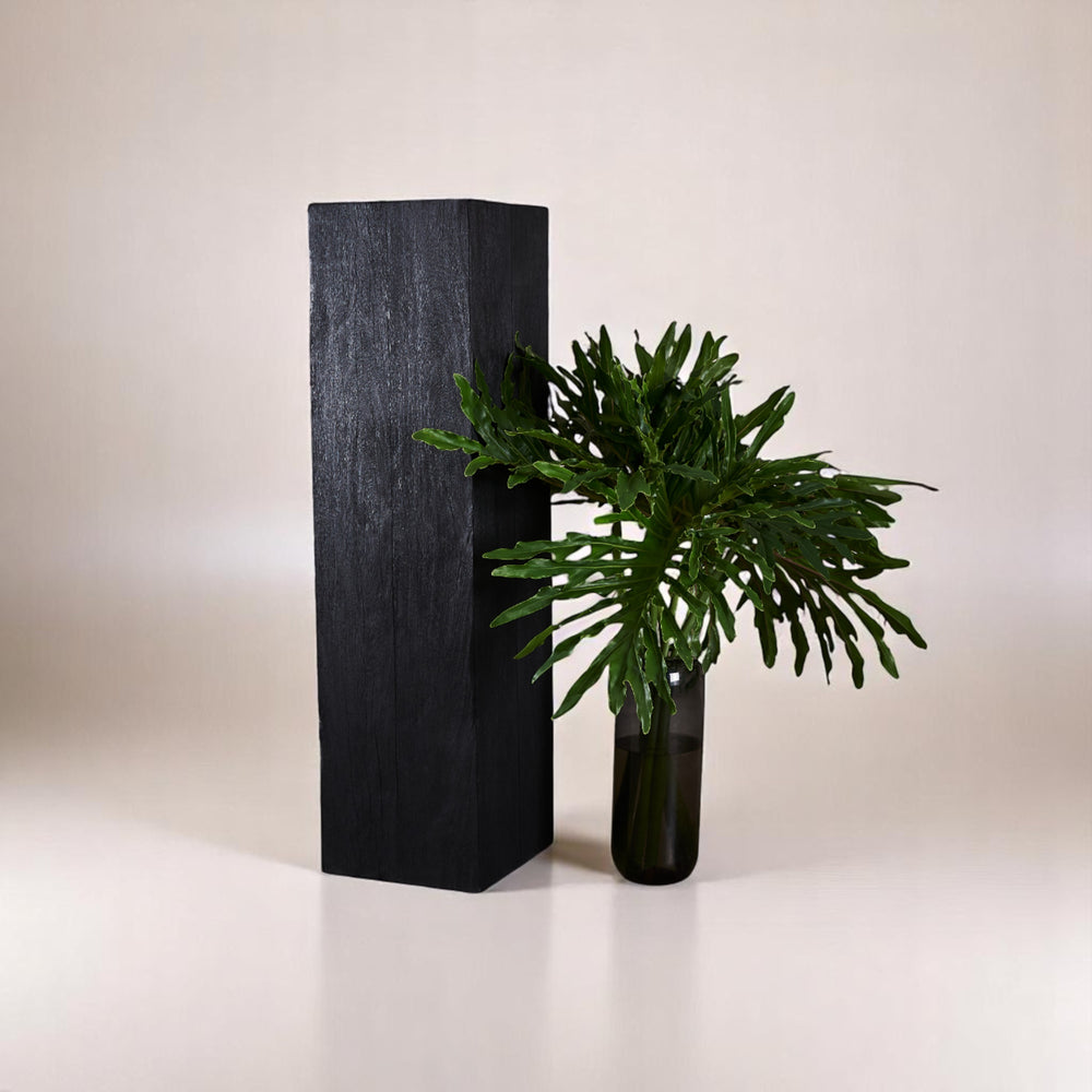 Square prism-shaped pedestal made from brushed solid rosewood planks on all sides. Hollow inside, making it lightweight and easy to move.