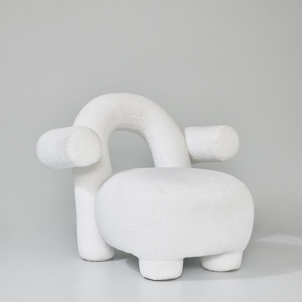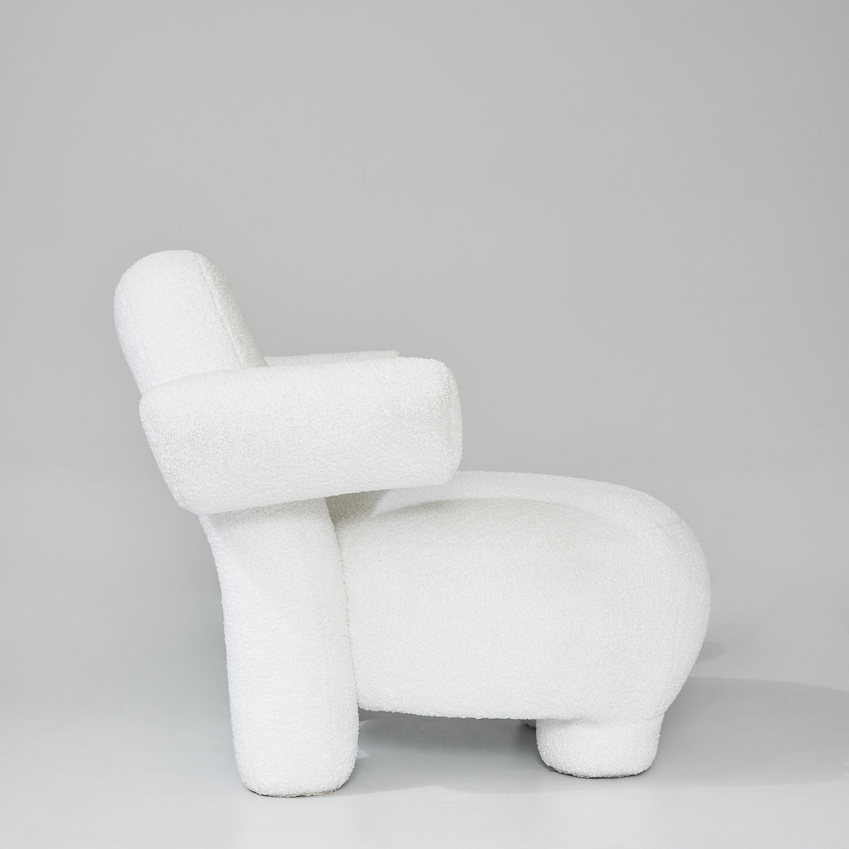 Lounge Chair with arms by Tu Taller, featuring playful curves and upholstered in green fabric. COM (Customer's Own Material) available.