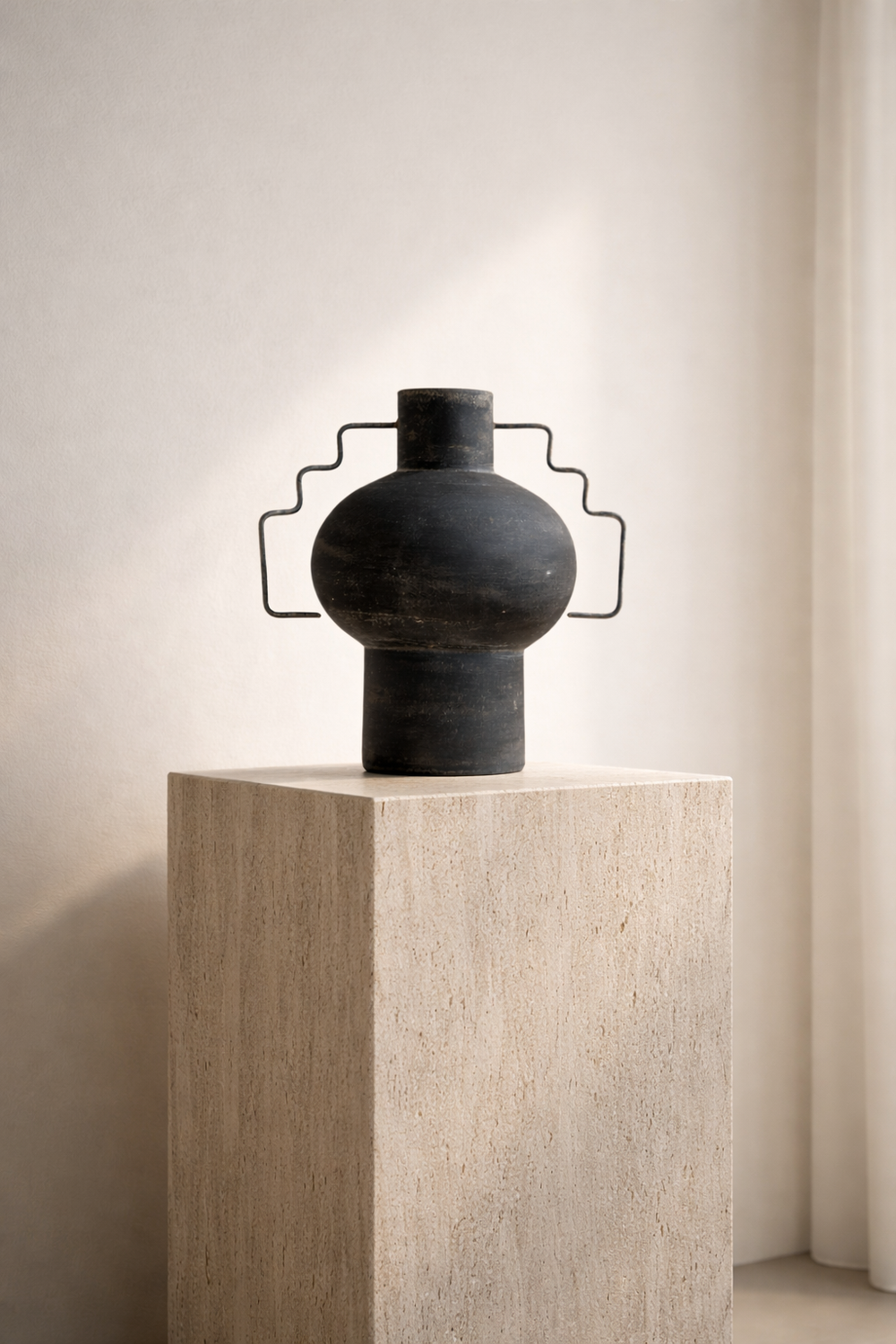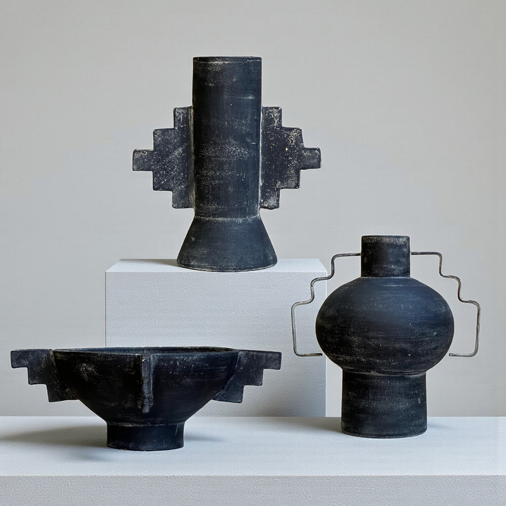 Terracotta Vessel in Charchoal Finish with Iron Details.