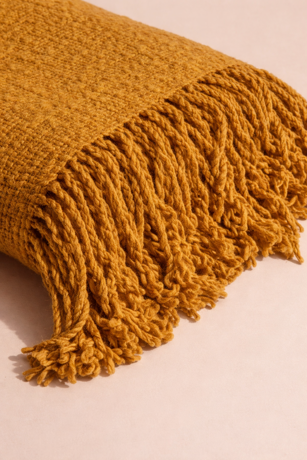 Wool Throw woven in a pedal loom in Panipat, India. Mustard Color with wool frindge.