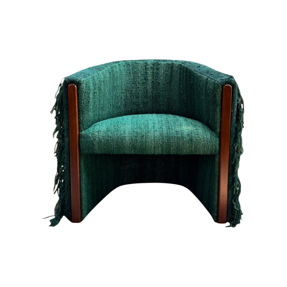 The Emerald Hilana Wool Chair explores functionality, shape, and craft. Artisans in Momostenango, Guatemala, weaved each piece in a pedal loom using hand-spun wool. Each piece is upholstered in Guatemala City, using pinewood.