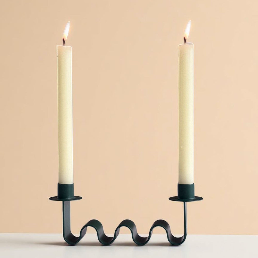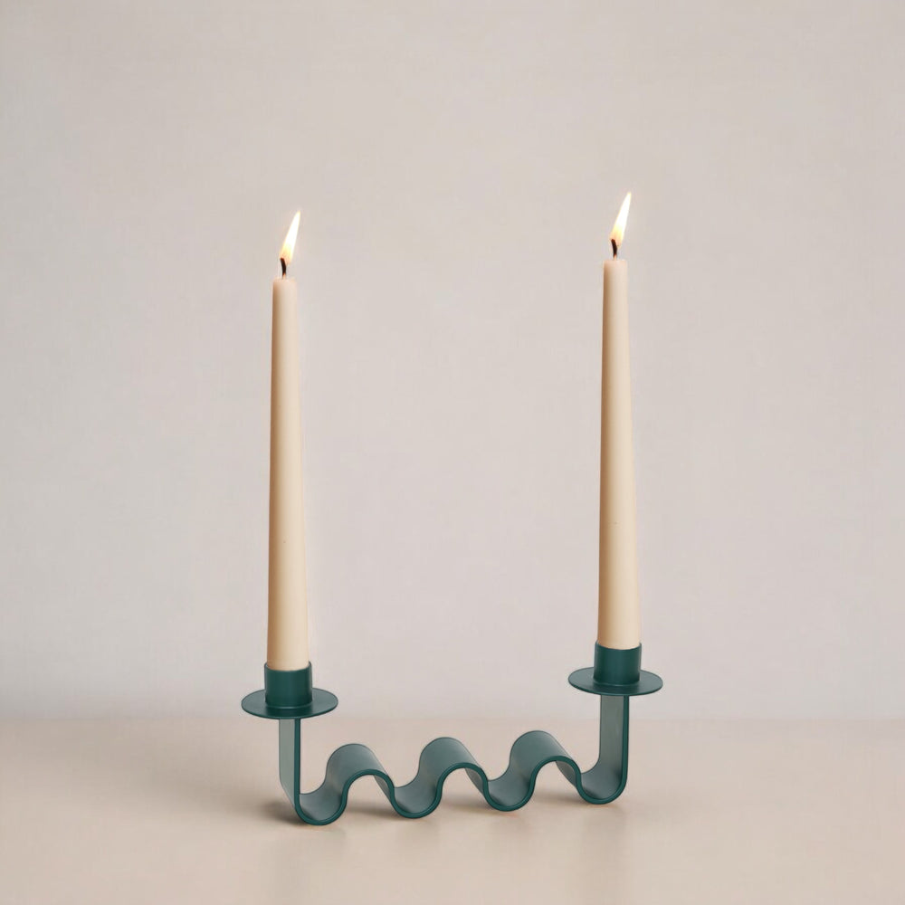 Wavy Forest Green metal candle holder for two taper holders. Handcrafted in India, Fair Trade Certified.