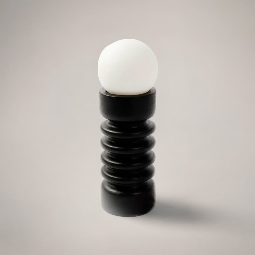 Table lamp in turned cedar wood with black burnt finish. Frosted Glass Globe. 110V.
