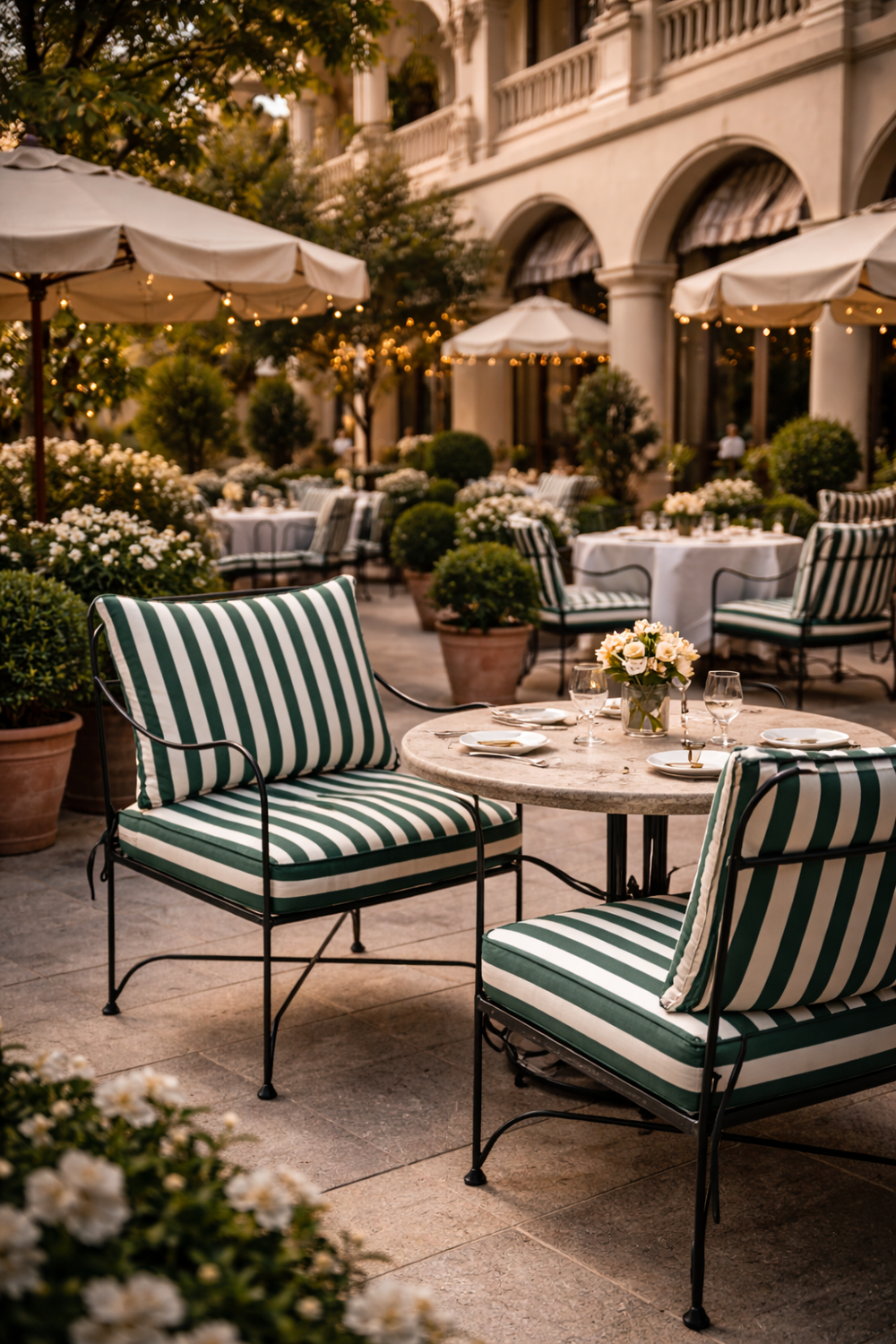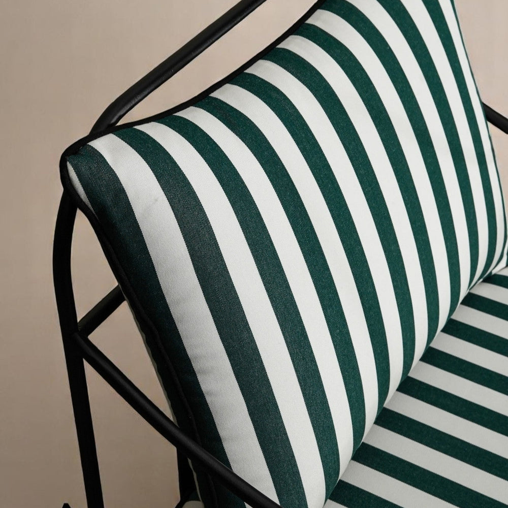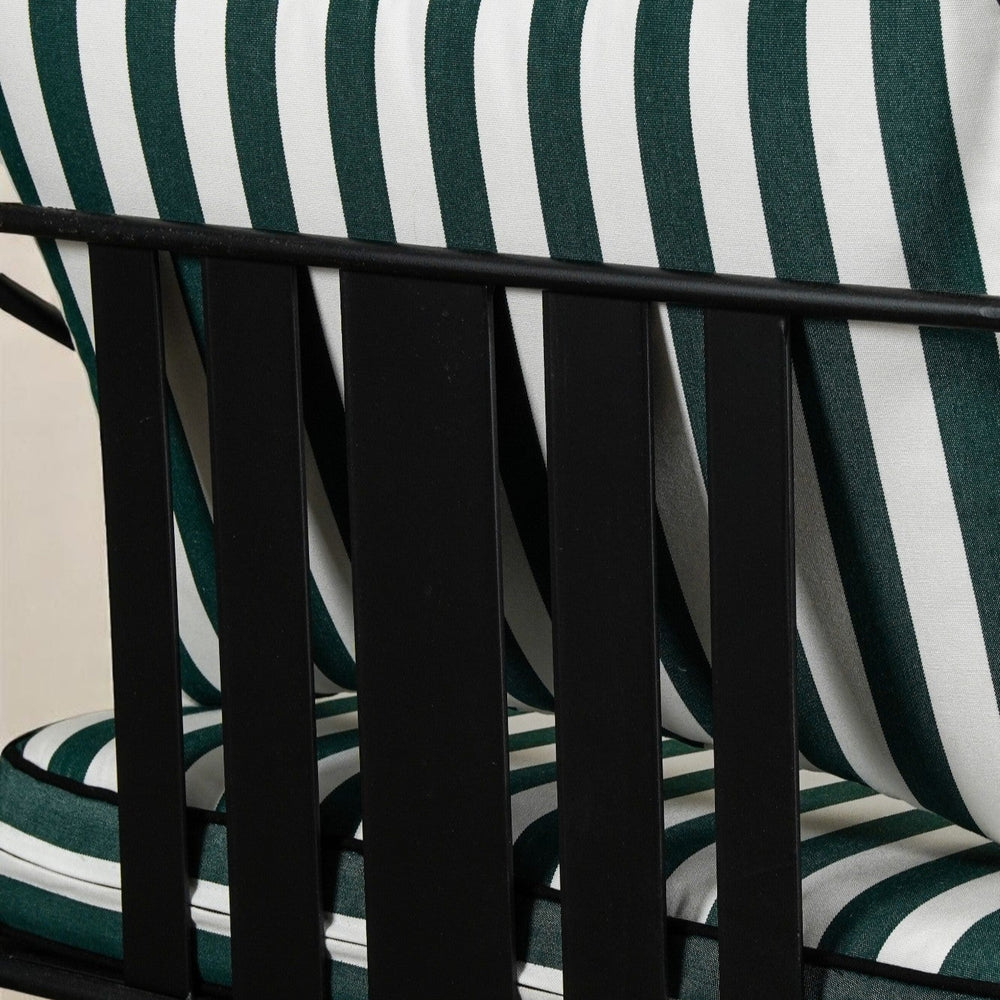 Wrought iron structure with black electrostatic powder-coated finish. Removable cushions upholstered in outdoor fabric, filled with medium-firm foam. Suitable for indoor and outdoor use.