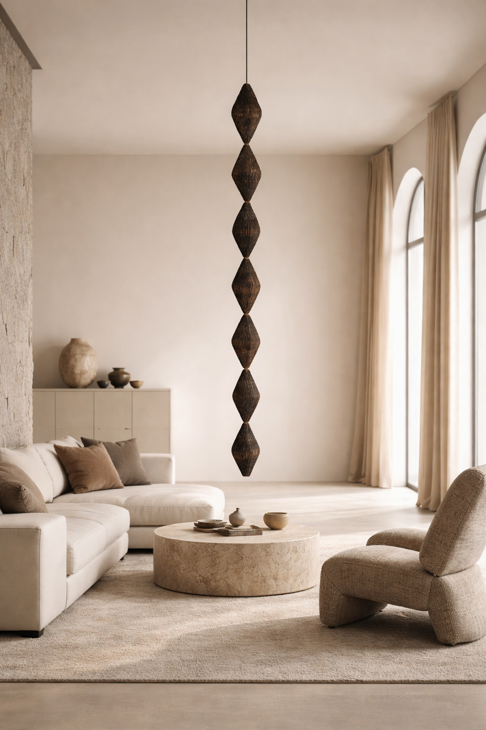 Hanging Terracotta Totem. Textured terracotta beads over stainless steel cable. Adjustable Height 3 ft. Handcrafted in Honduras.