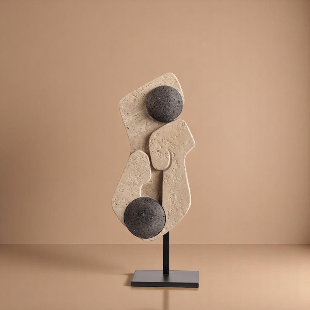 Sculpture on a stand made with travertine and volcanic stone. Wrought iron vase. Indoor and Outdoor Use.