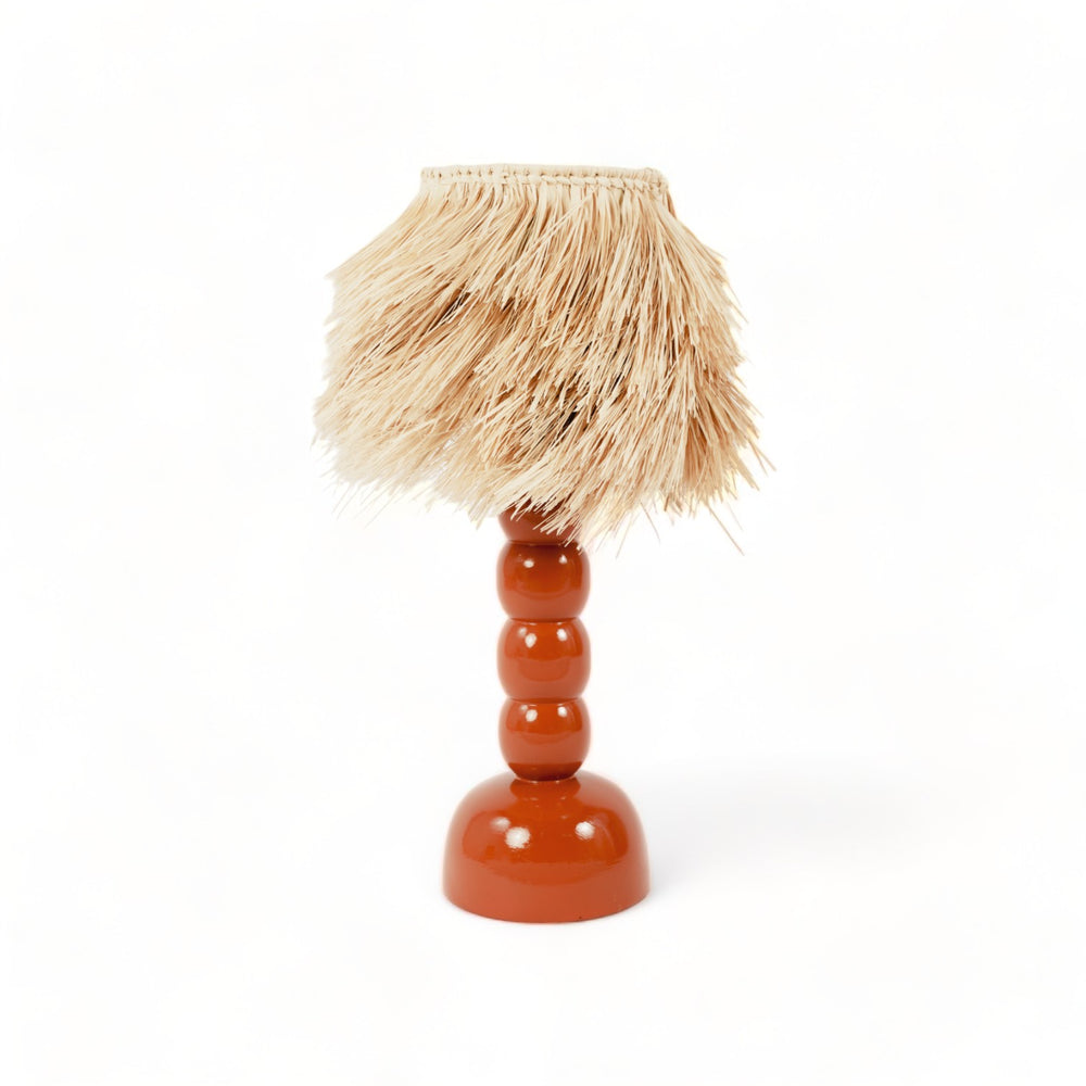 Table Lamp, base in turned wood lacquered ocre finish, lamp shade made of palm fiber. 110V.