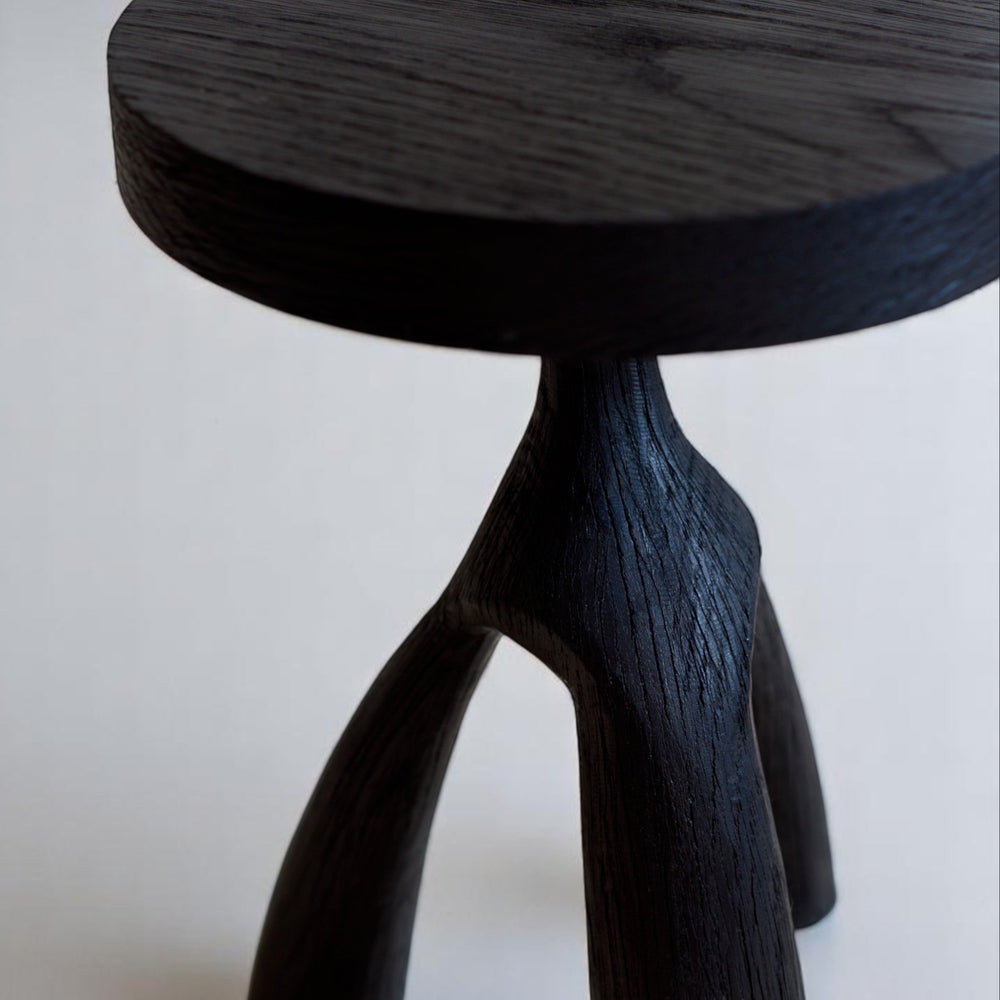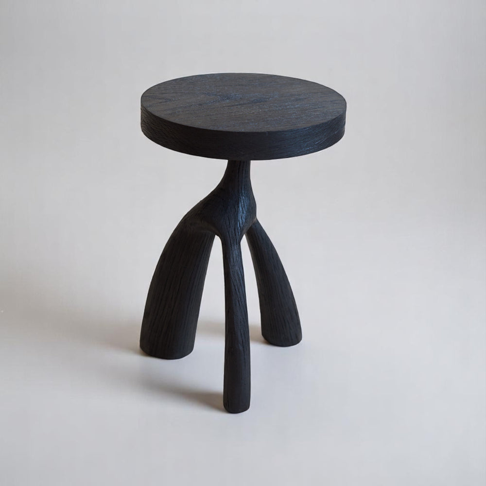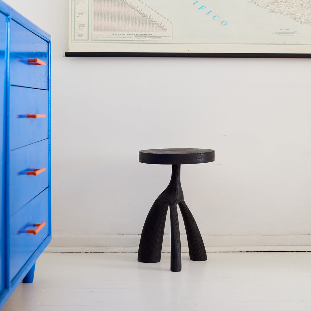 The Tecoli Side Table by Lørdag & Søndag. Designed in Mexico City and handcrafted in Oaxaca, Mexico, using oakwood in a burnt black finish.