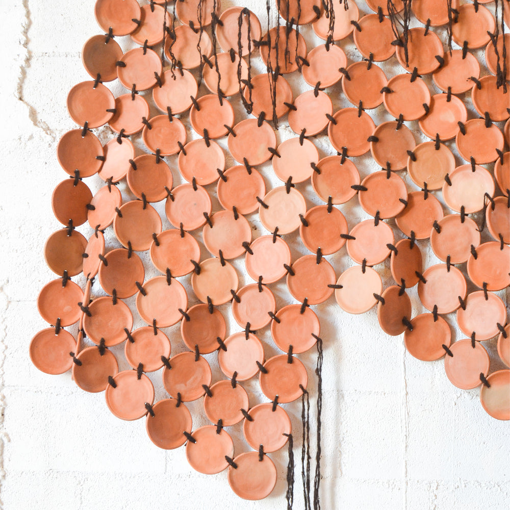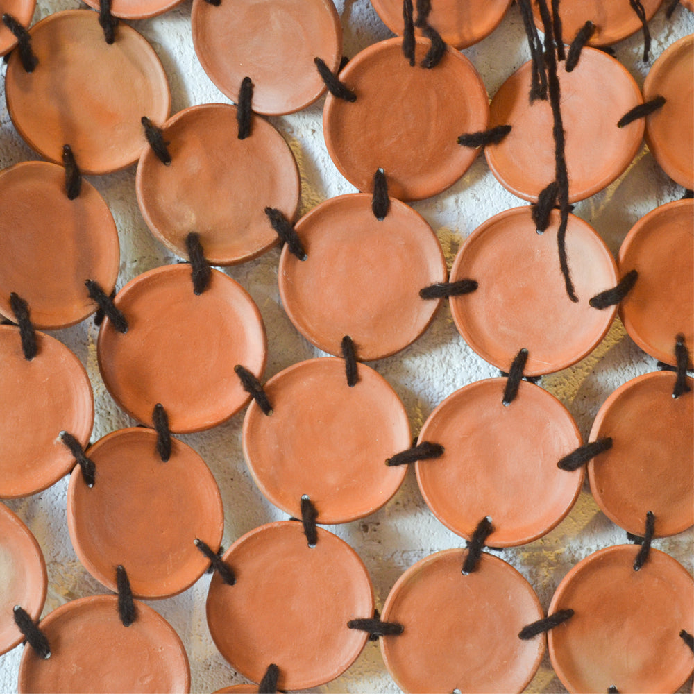 Tela de Barro by Diego Olivero explores textiles in a new form, using hard surfaces to create movement. Each disc is made with high-fire ceramics and then assembled in Honduras, using hand-spun wool from Guatemala.