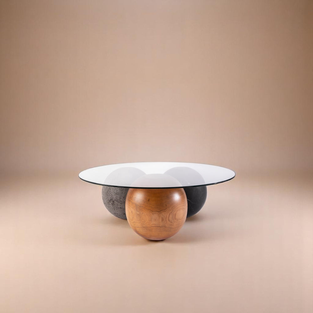 Round coffee table with jabin wood and volcanic stone spheres. Tempered glass top.